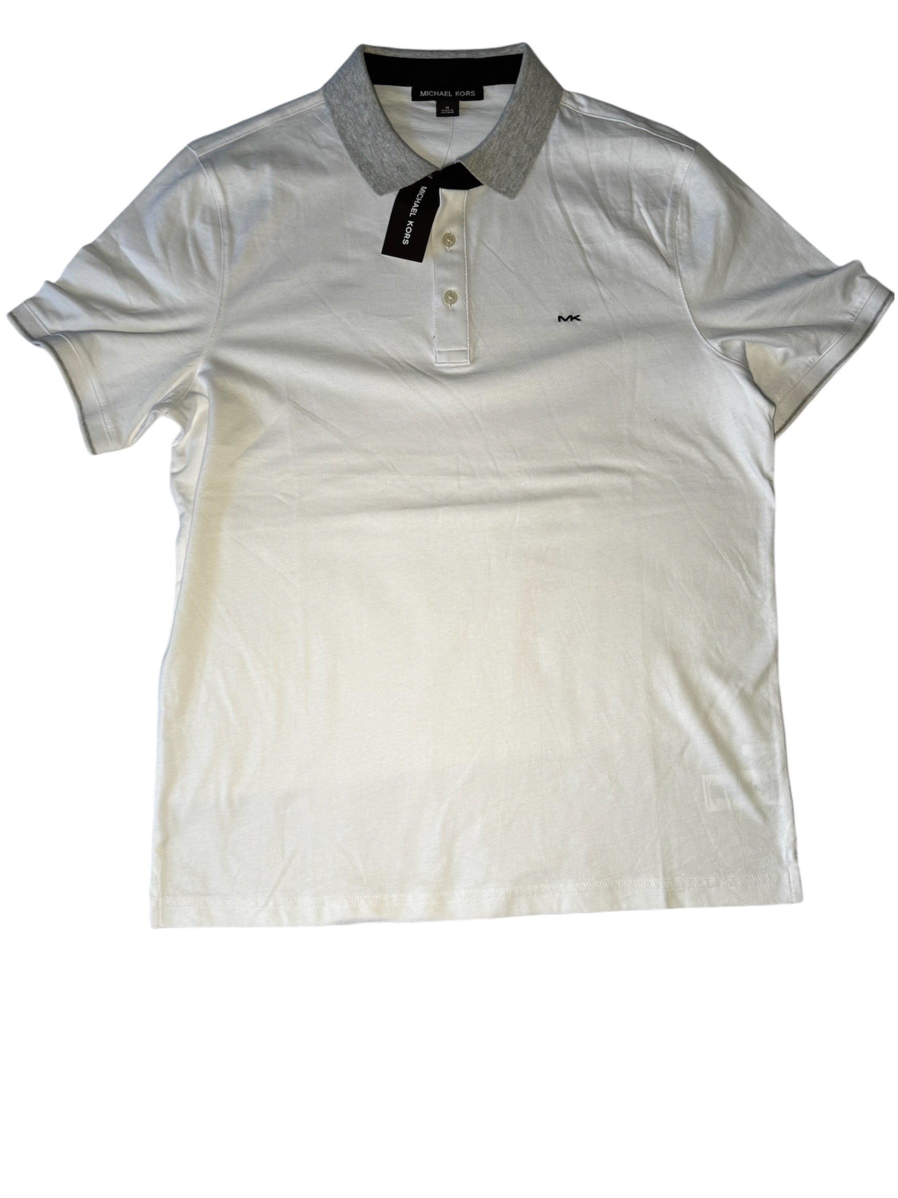 Camisa estilo polo para hombre marca Michael Kors en blanco con logo pequeño y cuello gris