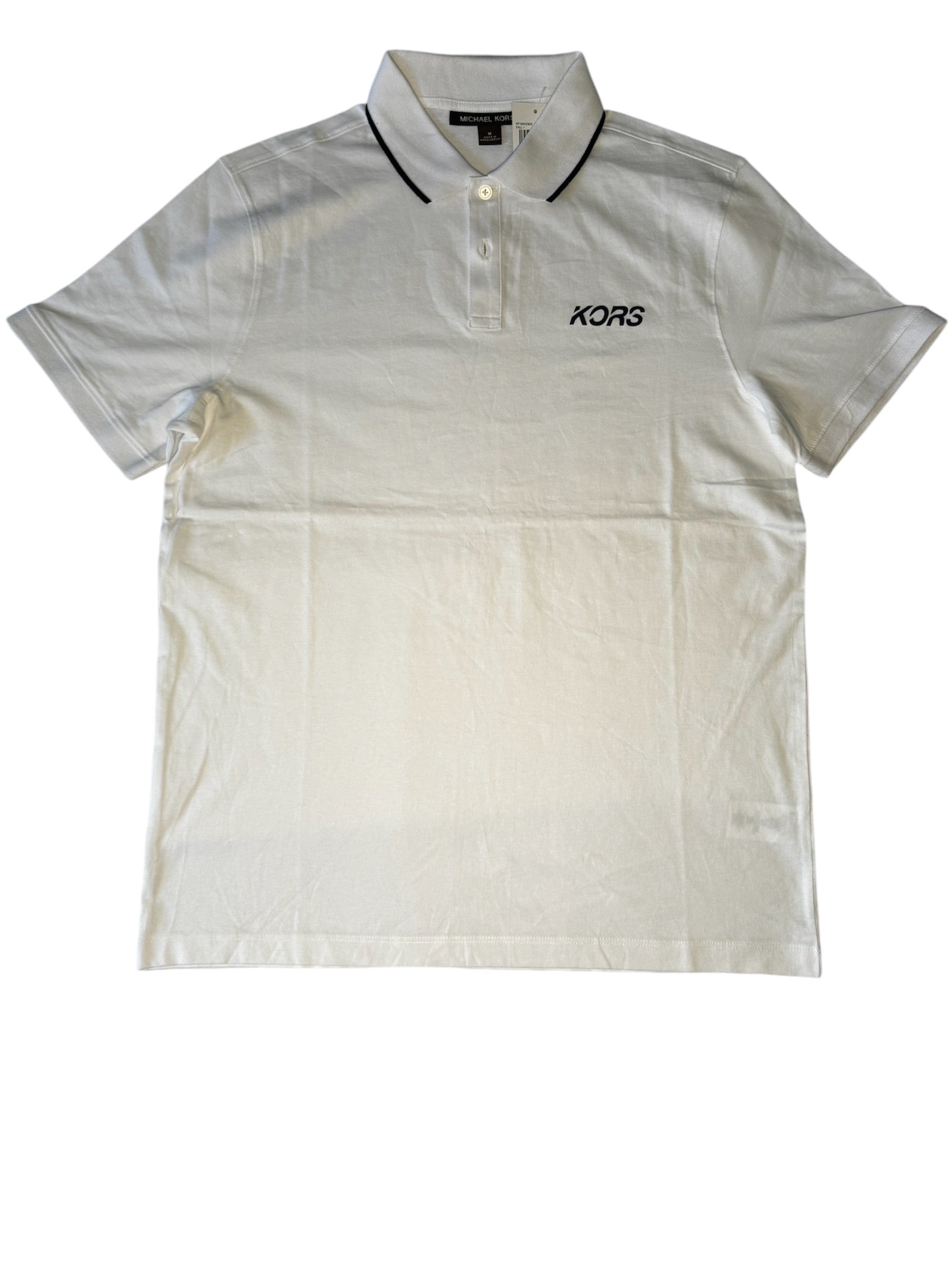 Camisa estilo polo para hombre marca Michael Kors en blanco con cuello navy logo “Kors” pequeño talla medium