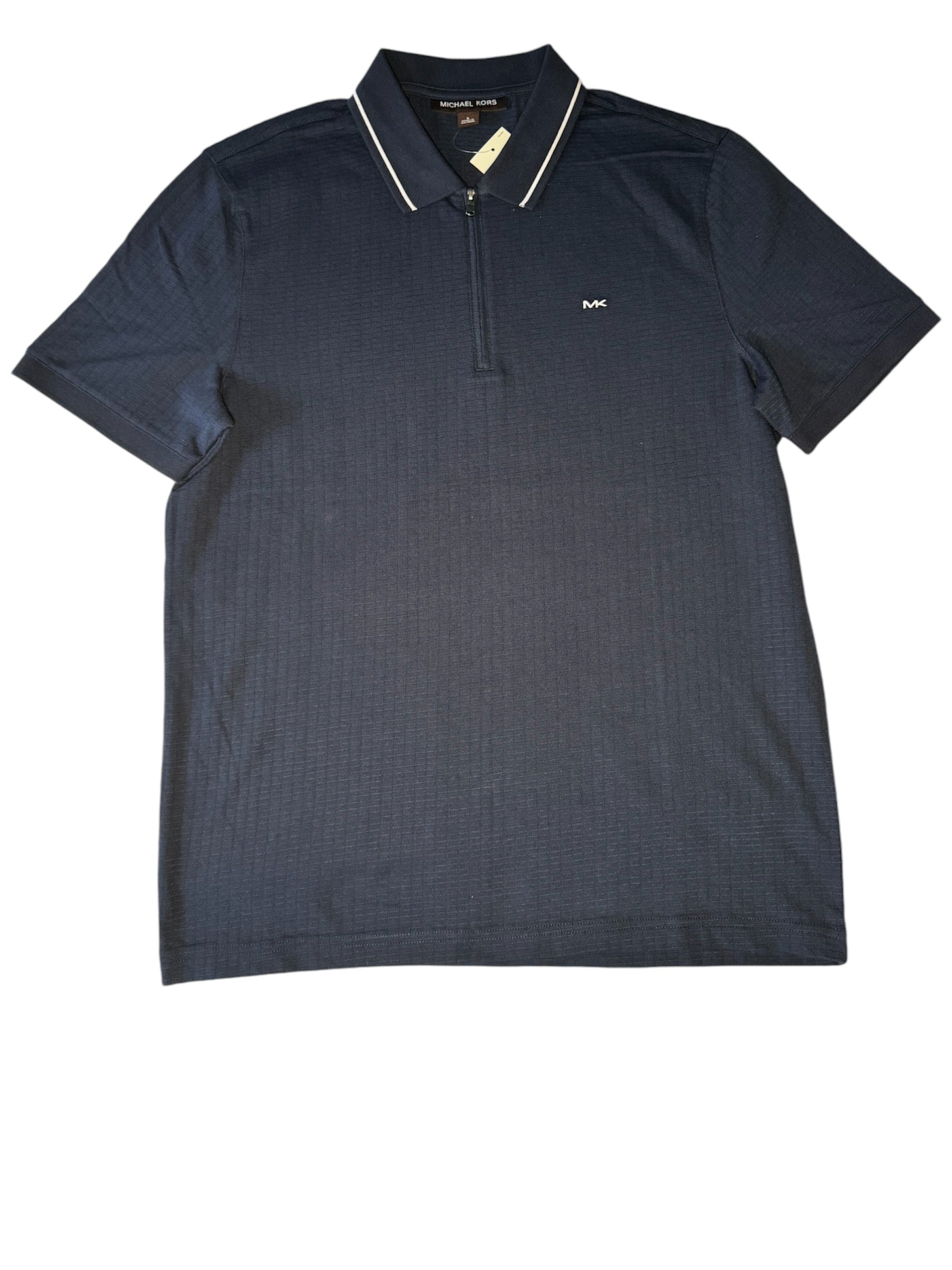 Camisa estilo polo para hombre marca Michael Kors en azul oscuro con zipper y logo pequeño.