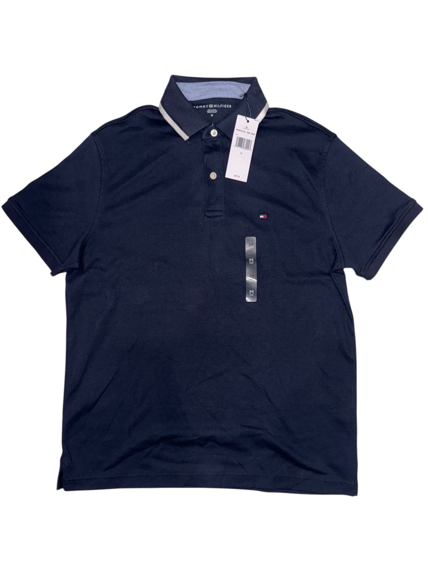 Camisa estilo polo para hombre marca Tommy Hilfiger azul oscuro con logo pequeño y blanco en cuello talla large