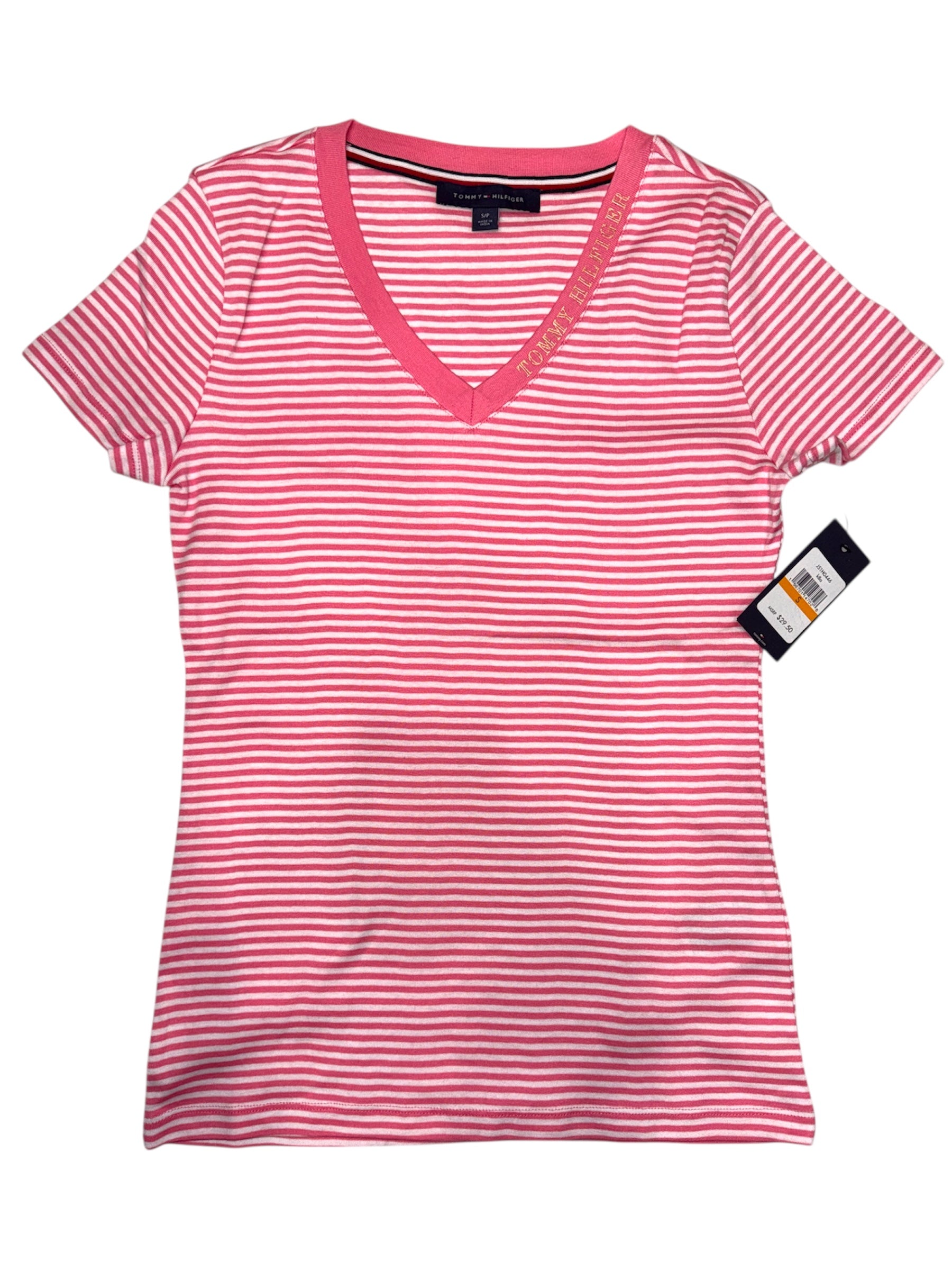 Camiseta Tommy Hilfiger en blanco con raya rosado con cuello “v”