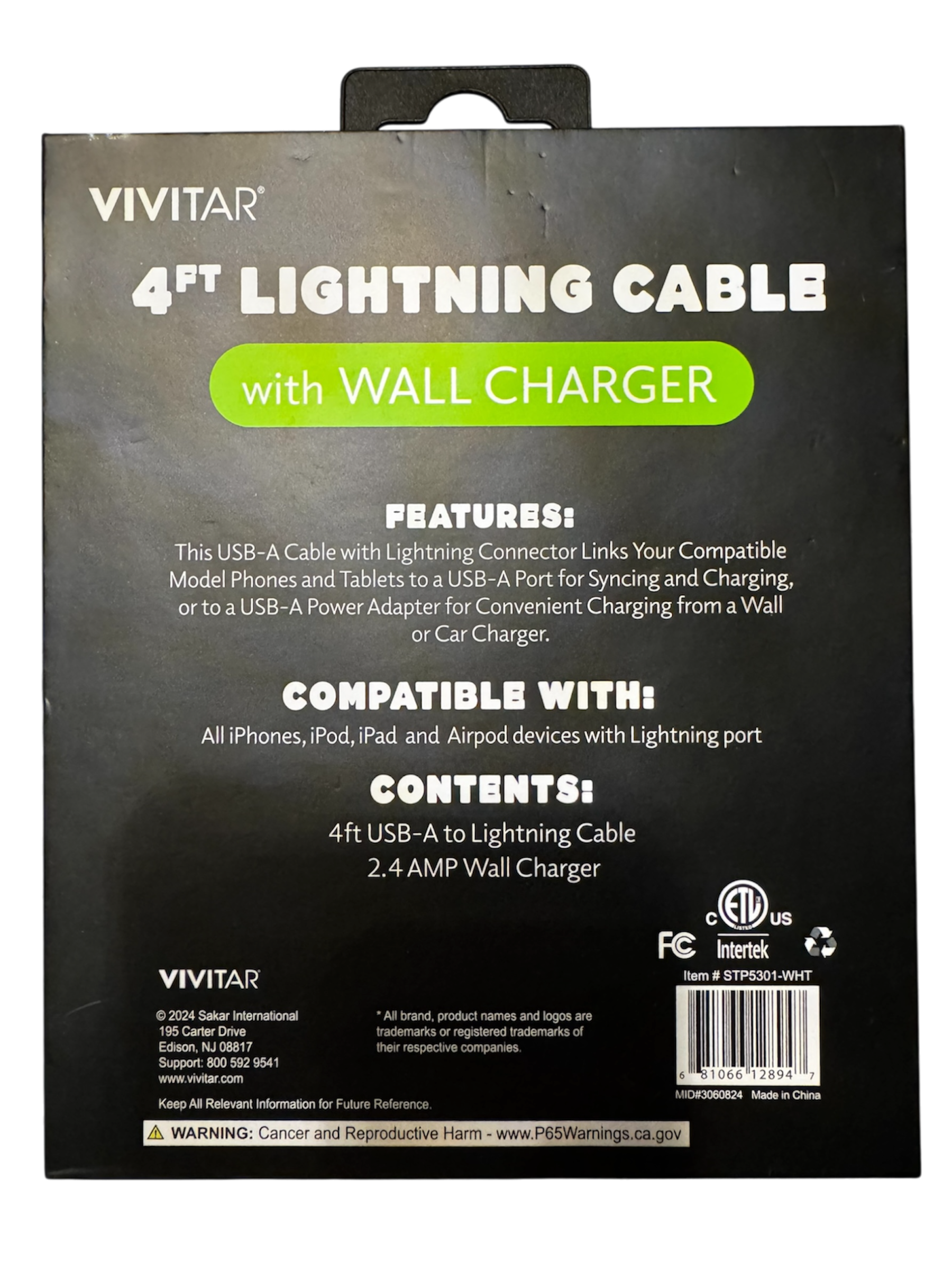 Vivitar 2.4 amp Charger 4ft Lightning Cable