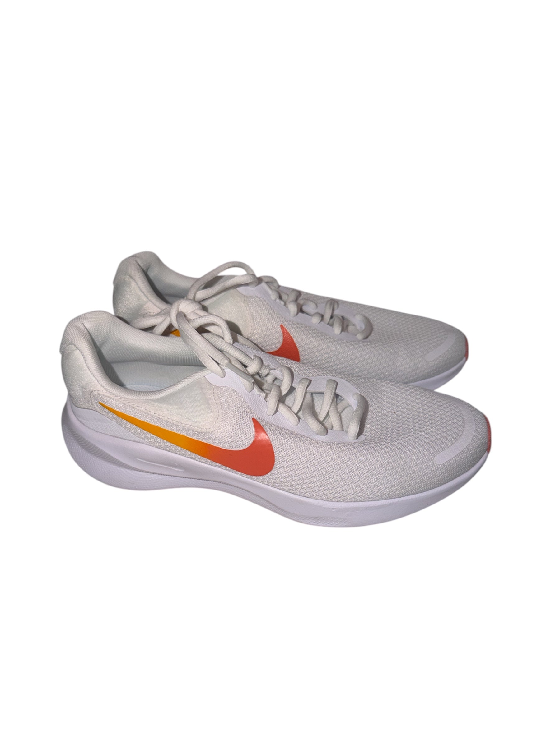 Zapatillas Nike blancas con upper de malla transpirable, suela ligera y acolchada, y Swoosh degradado en tonos naranja/amarillo que aporta un toque de color. Cómodas, flexibles y modernas.